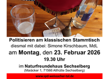 Der im Januar wegen Schneechaos ausgefallene 31. PoliTisch wird nun am Montag, 23. Februar 2026 im Naturfreundehaus Sechselberg nachgeholt. Diesmal mit dabei die Landtagsabgeordnete Simon Kirschbaum.
