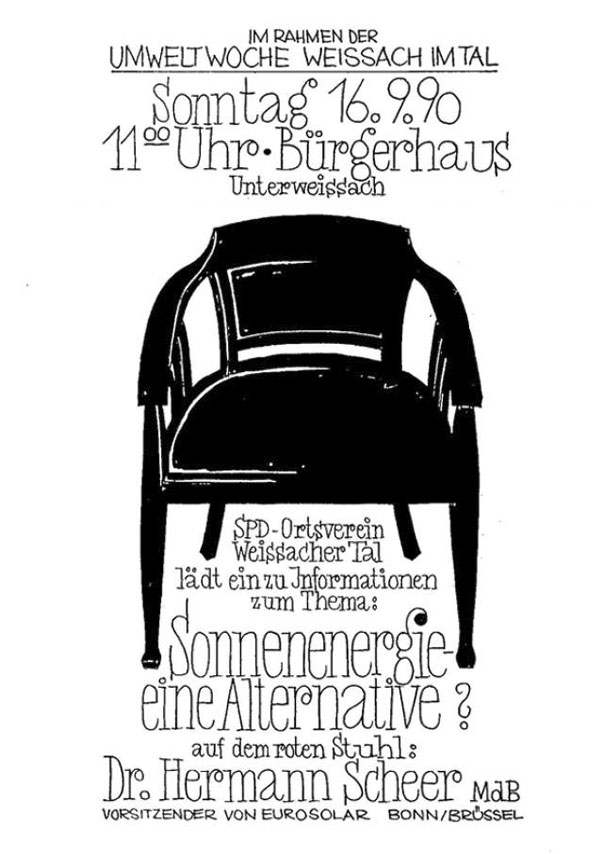 Als Abschluss der Umweltwoche der Gemeine Weissach im Tal fand der 2. Rote Stuhl ganz im Rahmen der altenativen Energiegewinning statt. Ein Gartenzwerg, der Bundeskanzler Helmut Kohl doch sehr ähnelte, hatte einen solarbetriebenen Mercedesstern auf dem Kopf und war auch der Aufhänger der Verantstaltung: Passen Regenerative Energiegewinnung, nachhaltige Verbrennungsmotoren und die bundespolitischen Ansichten zusammen? Die rund 80 Besucher bekamen einen Einblick in die (damals wie heute) aktuelle Diskussion, die von der Ausstellung des örtlichen Solarvereins begleitet wurde.